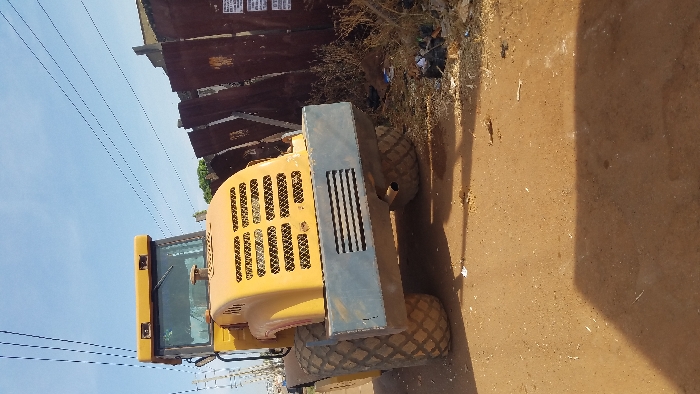 An outdoor scene in Jos, Nigeria, depicts the rear-left perspective of a stationary yellow road roller or vibratory compactor on an unpaved reddish-brown laterite surface