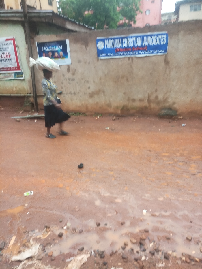 An adult female walks right-to-left across an unpaved, reddish-brown dirt road in Onitsha, Anambra State, Nigeria