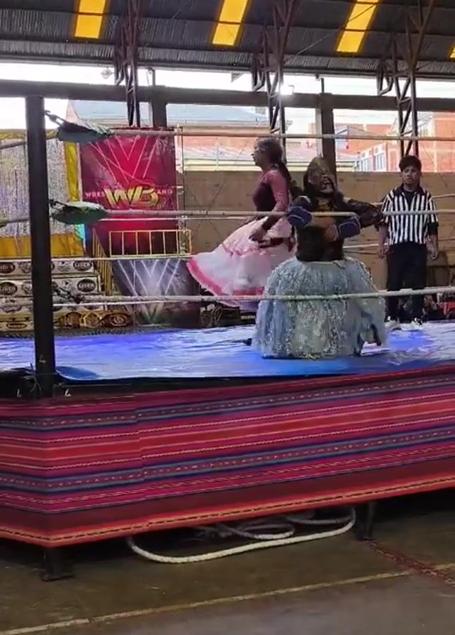 In a brightly lit indoor setting, a wrestling match unfolds in a ring decorated with colorful, patterned fabric. Two women, dressed in elaborate, voluminous skirts reminiscent of traditional attire, are the wrestlers. One woman is in a pink and white dress, while the other wears a blue and silver gown. Both have their faces covered. A referee in a striped shirt and black pants stands by, observing the match. One wrestler jumps off of the ropes to attack her opponent. Banners and logos are visible around the ring, indicating the wrestling organization. The camera is positioned at a low angle, providing a clear view of the wrestling action. The ceiling is high, with a yellow and gray striped pattern.