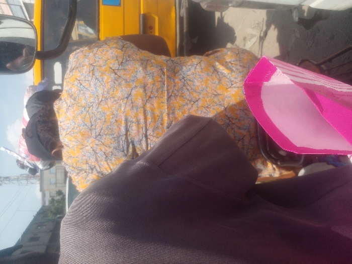 A person wearing a yellow and grey patterned shirt sits in a vehicle, partially obscured by a dark purple or brown shirt. A pink bag is visible on the right side of the frame. Outside the vehicle, a blurred cityscape with buildings and a tower can be seen, suggesting an urban setting. The vehicle is partially visible, with the side mirror and a yellow exterior.