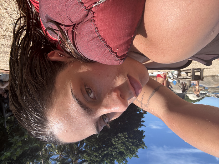 A female individual is depicted in a close-up, lying on her right side, with her head resting on a reddish-brown cushioned object. Her dark brown hair is wet, and her skin, notably on her forehead and left arm, exhibits visible water droplets. She has dark eyebrows, light brown eyes, and a script tattoo is visible on her left forearm. A portion of a dark-colored swimsuit or top is visible on her upper body. The scene is a sunny beach in ตำบล เกาะเต่า, Thailand, characterized by light-colored sand, numerous large, smooth boulders, and tropical vegetation, including palm trees, lining the background under a clear blue sky. In the mid-ground, several other individuals are present: one woman in a light-colored bikini stands near a wooden table and rocks, another is seated on the sand wearing a red bikini bottom, and additional figures are discernible further back.