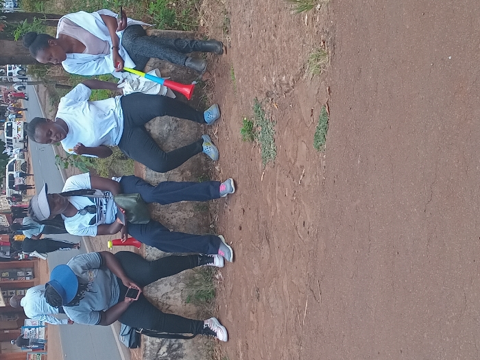 Four women are seated on a concrete curb in the city of Murang'a, Kenya. The women are all wearing casual clothing and are engaged in various activities, including looking at a phone, holding a red plastic horn, and talking. Two are wearing white shirts, one wearing a blue shirt and one wearing a white shirt with an Adidas logo. Two women are wearing hats. There are several vehicles parked in the background, and a tree to the right. The ground is covered in dirt and gravel. The scene is casual and relaxed.