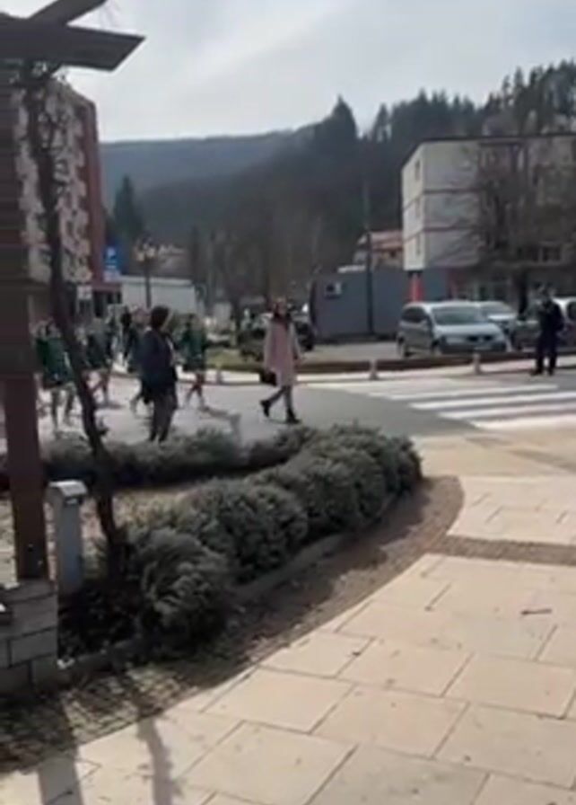 group of people marching in a parade. They are wearing green and white uniforms. The parade is taking place in a town square. There are buildings, trees, and cars in the background. The sky is cloudy. A red and white streamer is attached to a wooden structure. People are walking along the crosswalk.