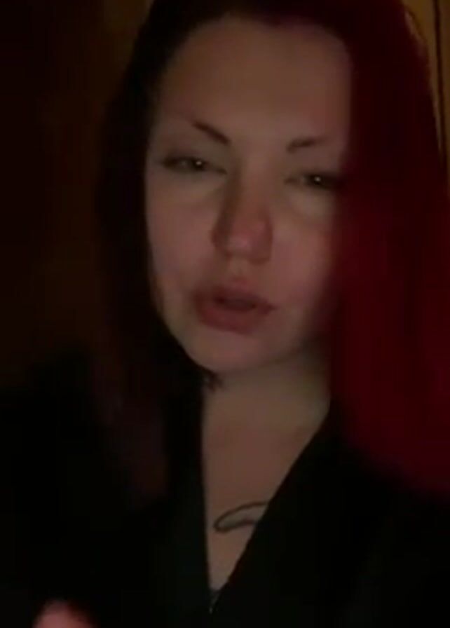 woman with dyed red and dark hair, a tattoo on her chest, and tattoos on her hand, holding a lit object that resembles a cigarette, and blowing out smoke