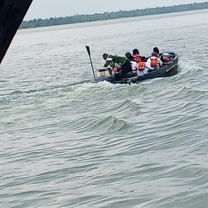 An open, motor-powered boat traverses a waterway in Koko, Nigeria, under an overcast sky