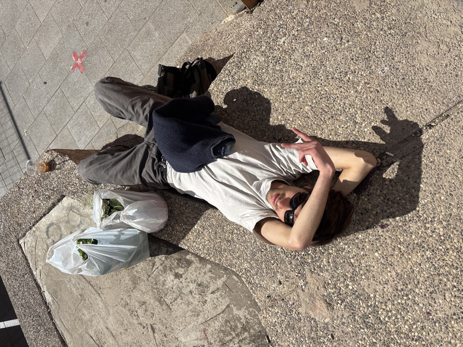A person is observed lying supine on an exposed aggregate concrete surface in Tel-Aviv, Israel, under direct sunlight