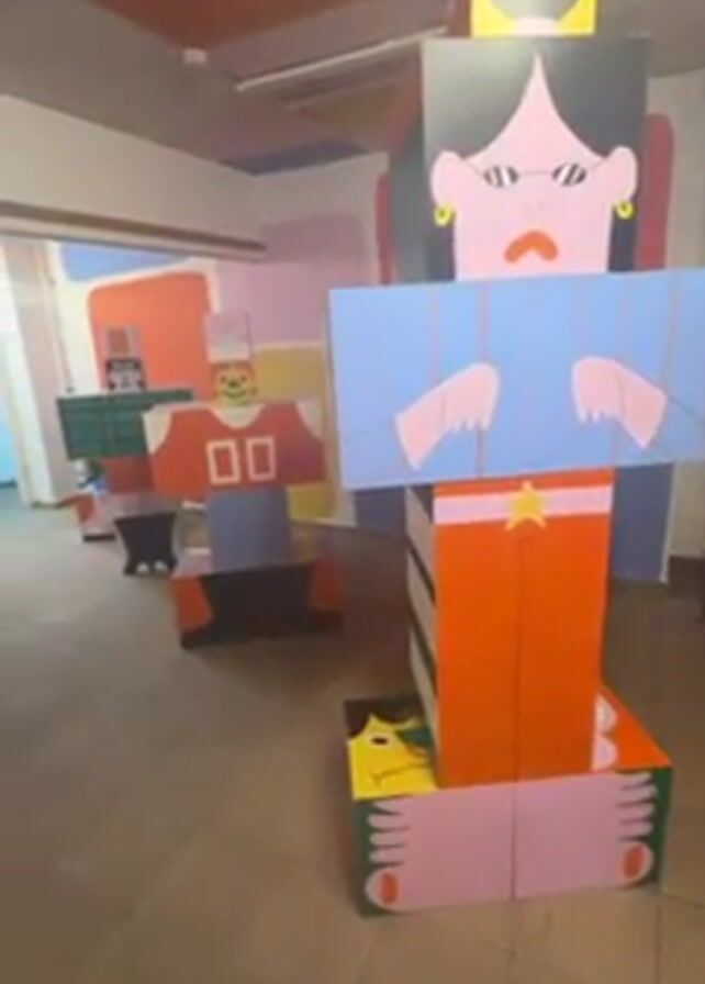 The camera slowly pans across a brightly colored art installation. Several cartoonish figures made of stacked cubes and rectangular prisms are visible. The figures include a woman in glasses, a football player, and other abstract characters. The walls are painted with large, colorful shapes. The room appears to be an art gallery or exhibition space.