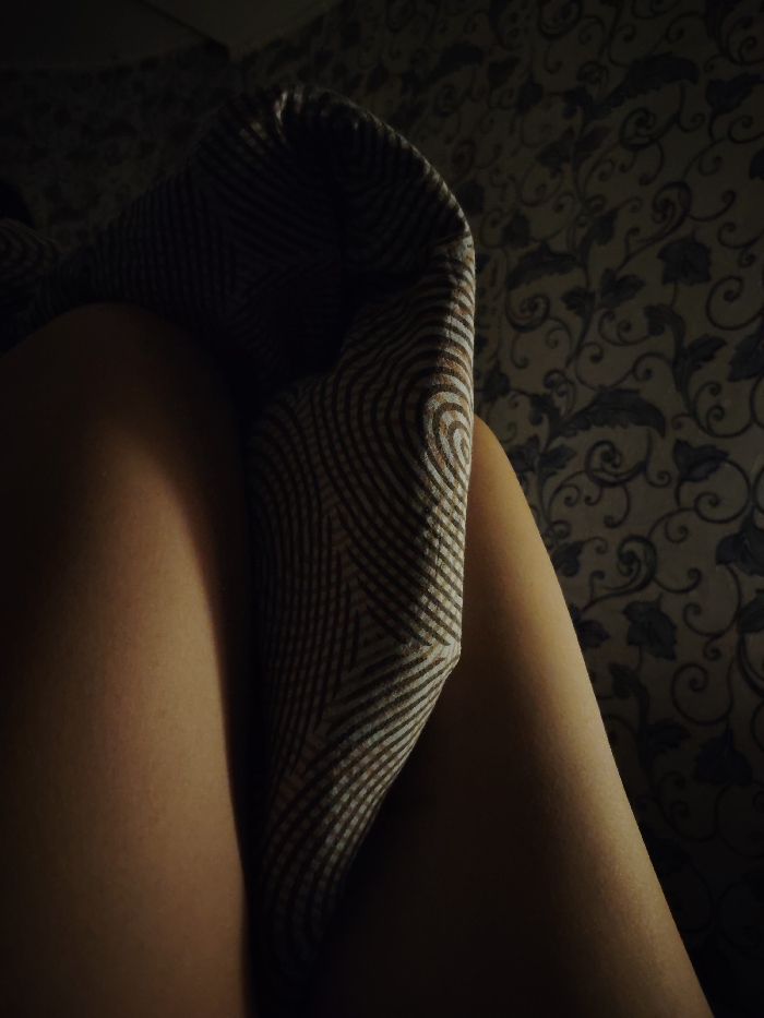 A dimly lit image shows a person's legs crossed, partially covered by a patterned blanket
