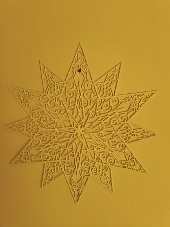 A golden-yellow, embossed star design fills the frame. The star has multiple points, each intricately decorated with geometric and swirling patterns. A small, round, dark red object is located near the tip of the topmost point. The star's design is primarily composed of lines and curves, forming a delicate, lace-like appearance. The background is a smooth, uniform color, providing contrast and highlighting the star's details.