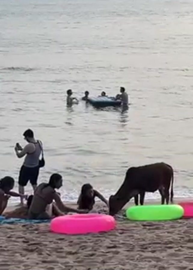 beach scene with several elements of interest. In the foreground, a brown cow stands near the shoreline, appearing to graze or investigate items scattered on the sand, including bright pink and green inflatable rings. Several people are seated or standing nearby, some interacting with the cow. Further back, a group of individuals are in the water, gathered around a white inflatable raft. One man on the beach is taking a photo. In the distance, the ocean stretches out to the horizon, where a small, rocky island is visible. The setting sun casts a warm, golden glow over the water and the island. As the video progresses, two men are seen walking along the shoreline.