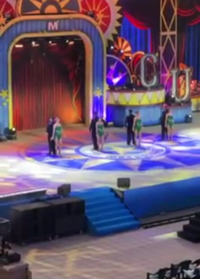 four pairs of dancers on a stage. The stage is decorated with colorful circus-themed elements, including an archway, a curtain, and large letters that spell out "CIRCUS". The dancers are arranged in a line across the stage, with each pair consisting of one man and one woman. The men are wearing black suits, and the women are wearing green sequined leotards. They are all facing the audience, standing still, and smiling. The audience is seated in rows, and some people are holding up their phones to record the performance. The stage is well-lit, and the overall atmosphere is festive.