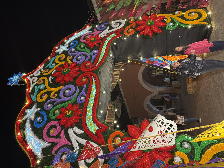 A vibrant, illuminated floral archway dominates the foreground, adorned with colorful paper banners. The archway features red flowers, swirling patterns in white, yellow, and purple, and a prominent star on the upper left. Behind the archway, a courtyard with stone arches is visible, with people strolling through it. Two women stand adjacent to the arch, one in a pink jacket and the other in a black puffer jacket, admiring the decoration.