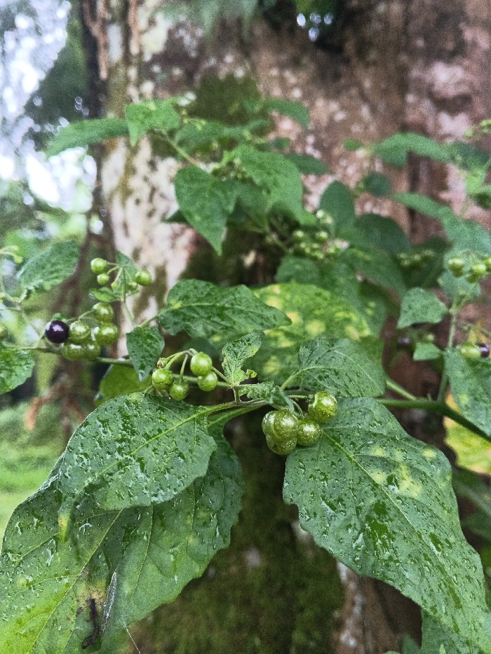 - "A close-up photograph captures a plant bearing green leaves and spherical berries, set against a blurred background of a tree trunk and foliage" by FM-9koYK2, licensed under CC BY 4.0