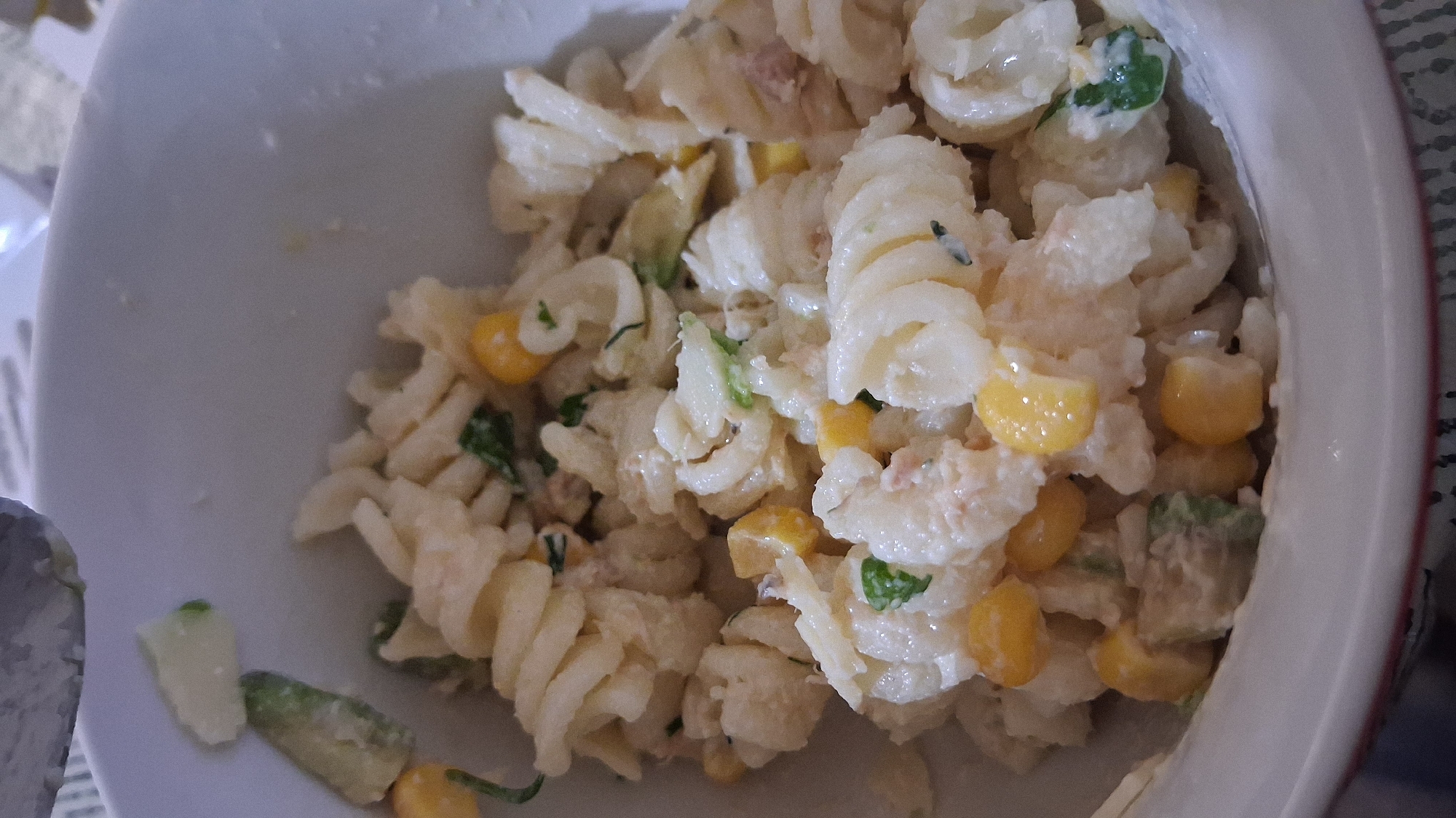 A close-up shot shows a bowl of pasta salad. The salad consists of spiral pasta, corn kernels, possibly tuna, and some green herbs or vegetables, all mixed in a creamy dressing. The bowl appears to be ceramic with a white interior and a slightly textured exterior. The lighting is soft and diffused. The image was taken in Goce Delchev, Bulgaria.