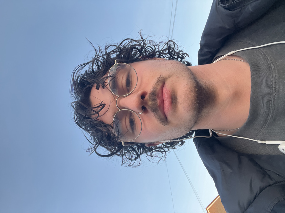 A low-angle, close-up selfie shows a young man with curly dark hair, a mustache, and light stubble
