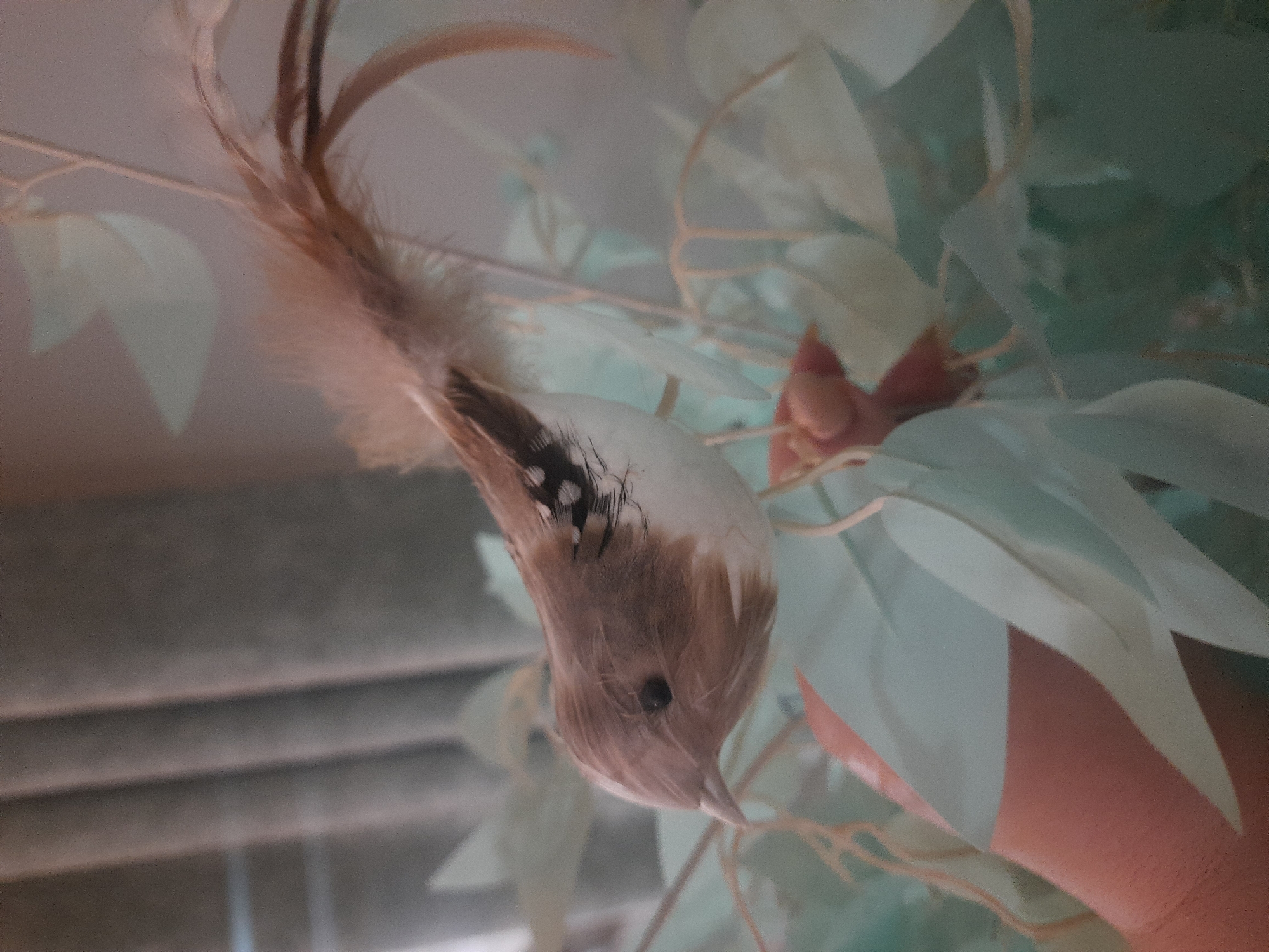 decorative bird with brown and white feathers, mounted on an artificial plant with light blue leaves. The bird has a small black eye and elongated tail feathers. Blinds are visible in the background. The location cannot be determined from the image alone and may not be in Al Hadaba, Egypt.