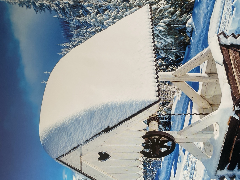 The image depicts a snowy winter landscape in the city of Anapa, Russia. A wooden well structure, positioned centrally in the foreground, is the primary subject, heavily covered in white snow. Its roof is an inverted V-shape, rounded by a thick blanket of snow. The front gable of the well house is constructed from white-painted wood and features a heart-shaped cutout near its peak. Below the roofline, a decorative scalloped trim runs along the eaves. On the left side of the well house, a dark, aged wooden wheel, appearing to be iron-banded, is mounted, with a segment of metal chain hanging vertically from its axle into the snow-filled well basin. The well's base is constructed from stacked horizontal logs, partially visible and also covered in snow. The supporting frame consists of white wooden beams. The immediate surrounding ground is covered in deep, undisturbed white snow. The background features a dense forest of snow-laden coniferous trees, primarily fir or spruce, with their branches heavily dusted. The sky above presents a gradient of blue, transitioning from lighter hues near the horizon to a deeper, darker blue higher up, with some darker cloud formations visible on the right. No individuals, animals, or specific actions are depicted.