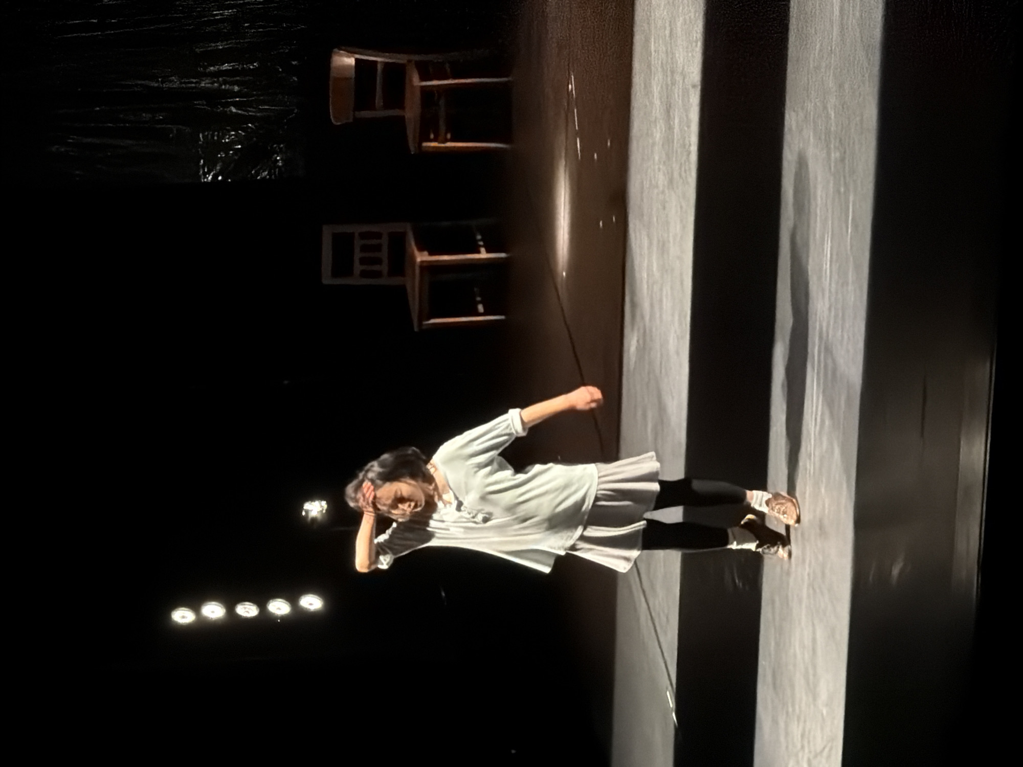 - "A person wearing a white dress, black tights, and sneakers stands on a stage in a dark room, possibly a theater, under stage lighting, with furniture visible in the background" by FM-Qeqql1, licensed under CC BY 4.0
