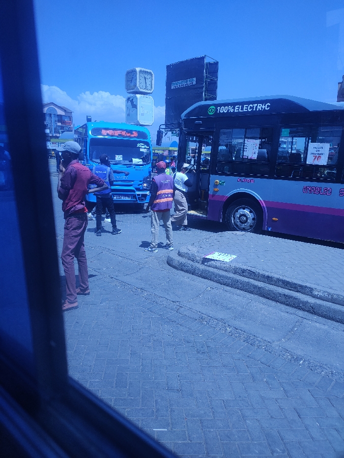 The image displays a daytime street scene in Ngong ward, Kenya, under a clear blue sky with some distant clouds. The foreground is occupied by a paved area constructed from grey interlocking bricks. Two public transport vehicles are prominent. On the right, a large grey and purple electric bus is parked, featuring "100% ELECTRIC" text on its side, the identification "E4003", and partial text "ENABLED S-". Its front door is open, revealing a white sign with "70" in red text. To the center-left, a smaller light blue Isuzu minibus is parked, displaying "MPLI" on its destination board and license plate "KDU 977B". Six distinct individuals are visible. In the foreground left, a man wearing a maroon shirt, dark trousers, and a light cap stands with his back partially to the camera. Three men are positioned around the front of the blue minibus; one wears a dark blue shirt, and another wears an orange reflective safety vest over light clothing. Near the open door of the electric bus, two men are visible, one in a white shirt and light trousers. The individuals appear to be standing or waiting near the vehicles. In the background, two square clocks are stacked vertically on a structure, with the top clock indicating approximately 9:15. Behind these clocks, a large, dark-framed billboard structure is visible, partially obscuring distant buildings. A small, white rectangular sign or paper lies flat on the curb next to the electric bus. The overall image has a strong blue tint.
