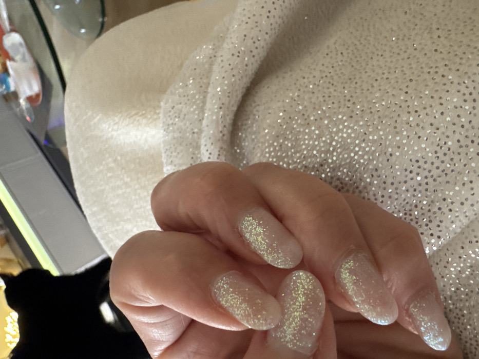 A close-up photograph taken indoors in the city of Nice, France, features a light-skinned human hand with fingers gently curled. The fingernails are almond-shaped and coated with a translucent, iridescent glitter polish. The hand is positioned against a light-colored, shimmering textile embedded with numerous fine silver glitter particles. Behind this, a softer, plain off-white fabric is visible. In the blurred upper left background, a partial silhouette of a black cat is discernible, alongside indistinct domestic objects and a horizontal bright green light source on what appears to be a reflective surface.