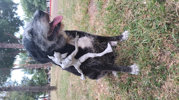 A black and gray furry dog lies on its side on grass, tongue hanging out. A gray figurine of a person lies on top of the dog. The dog is covered in light-colored specks. Trees, grass, and a blurred building are in the background.