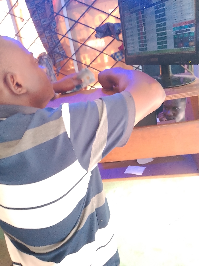 An image captures an indoor scene within a commercial establishment in Lokoja, Nigeria. In the foreground, an adult male of Black ethnicity is observed from a partial rear-side angle. He wears a short-sleeved polo shirt with horizontal stripes of blue, grey, and white. His left arm is bent, and his left hand rests on a wooden surface, holding a stack of currency notes, consistent with Nigerian Naira. He is oriented towards a dark-colored computer monitor, which displays a data-rich interface, possibly a spreadsheet or betting platform. The monitor is dusty and rests on a multi-tiered wooden shelf unit. Beneath the upper tier of this wooden shelf, a second adult male, also of Black ethnicity, is partially visible, peering upwards with his face directed towards the primary subject or the monitor. In the background, behind the foreground individual, a metal security grid or window bars are discernible, with blurry, indistinct objects (possibly fabric or crumpled items) visible through the openings. Small white slips of paper are present on the lower wooden shelf. The environment suggests a functional commercial space, possibly a betting center or cybercafé, with interior lighting.