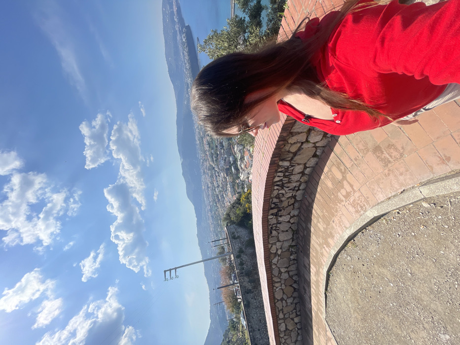 - "An outdoor image depicts a female individual in the right foreground, positioned in profile facing left, overlooking a panoramic coastal city identified as Meta, Italy" by FM-4OCh93, licensed under CC BY 4.0