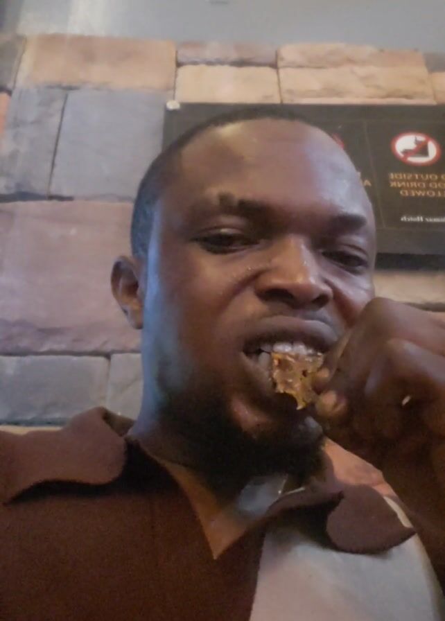A man is eating food. He has dark skin, a short beard, and a shaved head. He is wearing a brown shirt and a white undershirt. He is holding the food in his hand and bringing it to his mouth. The background is a brick wall with a sign that has various red icons on it.