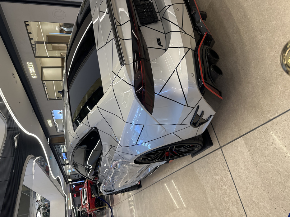 The image captures an indoor scene within a modern, multi-level shopping mall in Tashkent, Uzbekistan, identified by the retail storefront "12 STOREEZ" visible on the upper level. The primary subject is a white Audi RS7 luxury sports sedan, customized by ABT, featuring a distinctive geometric black line pattern across its body. The vehicle exhibits dark-tinted windows, a rear spoiler, prominent black multi-spoke wheels with red accents, and a rear bumper with a diffuser incorporating dual exhaust pipes framed by red trim. It is displayed on black risers on a polished light-colored tile floor. In the left background, a portion of a red sports car, secured by blue velvet ropes, is also on display. The mall features curved white architectural elements with integrated linear lighting and glass railings on upper levels. A single individual is faintly visible on an upper walkway in the far left. The scene is brightly illuminated by artificial overhead lighting.