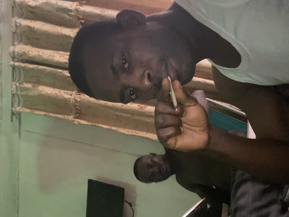 The image depicts two dark-skinned adult males indoors in what appears to be a private room within the city of Zaki Biam, Nigeria. The foreground subject, positioned on the right and in sharp focus, looks directly at the camera. He wears a white sleeveless undershirt and holds a lit, hand-rolled cigarette (joint) between his right thumb and forefinger, positioned near his mouth. A glowing ember is visible at the tip of the cigarette. The background subject, seated to the left and less in focus, wears a dark top and appears to hold a white object, possibly a book or tablet, in his left hand. The room features a light green wall with a small, dark flat-screen television mounted in the upper left. To the right, beige patterned curtains with a fringed trim are drawn. The lighting is dim.