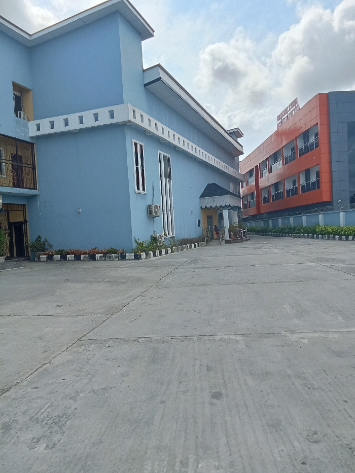 view of an empty parking lot in front of two buildings. The building on the left is blue and has a white trim, and the building on the right is orange and has a black and white trim. The parking lot is made of concrete and is empty. The buildings are located in Ujevwu, Nigeria. There is a small, dark green bush in the background near the orange building. The sky above the buildings is a light blue with white clouds. The sun is shining on the scene.