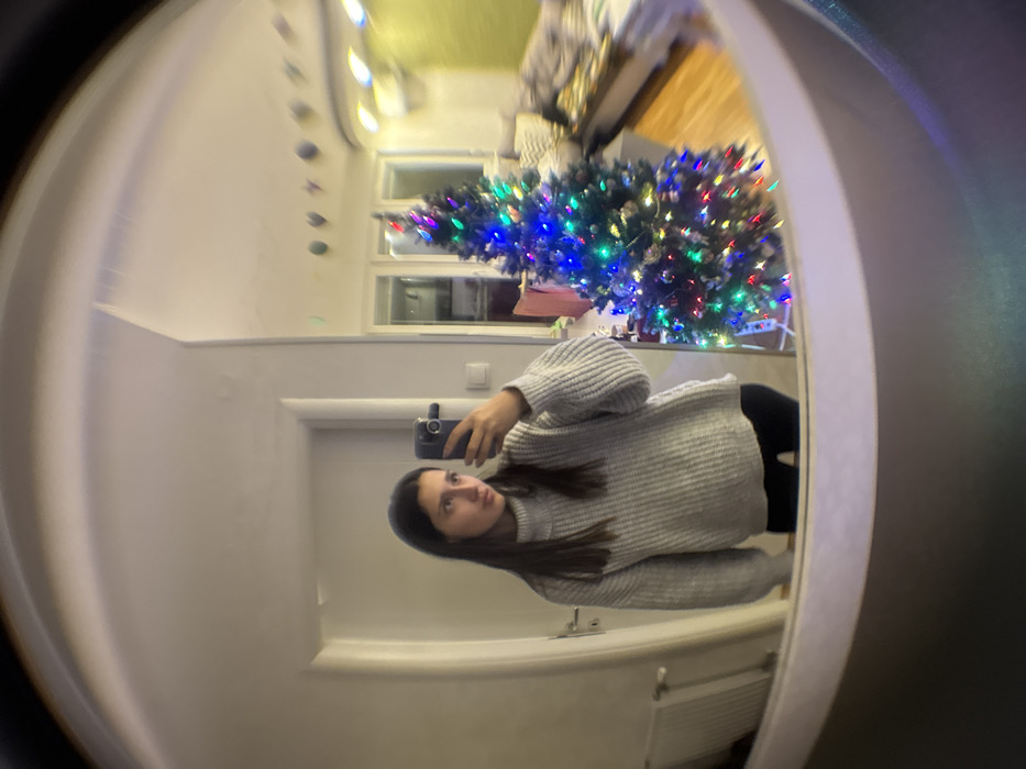 A fisheye mirror reflection shows a woman in a grey sweater holding a phone. She is in a bathroom with white walls, a vanity, and a radiator. In the background, a Christmas tree with colorful lights stands near a window. The reflection distorts the scene, curving the lines of the room and creating a wide angle view.