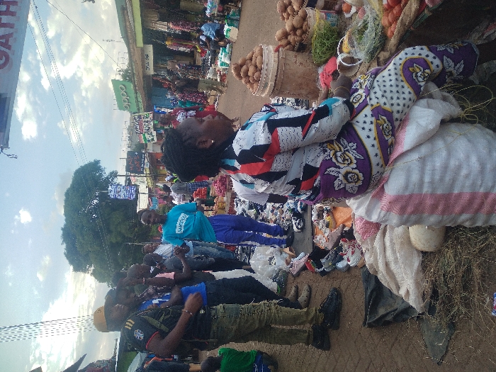 A woman is sitting in a busy outdoor market. She is surrounded by sacks and various items, including potatoes, and is wearing patterned clothing. Several people are standing nearby. The market extends into the background with stalls and people visible. An OPPO sign is seen on a building in the distance, and a cloudy sky is overhead.