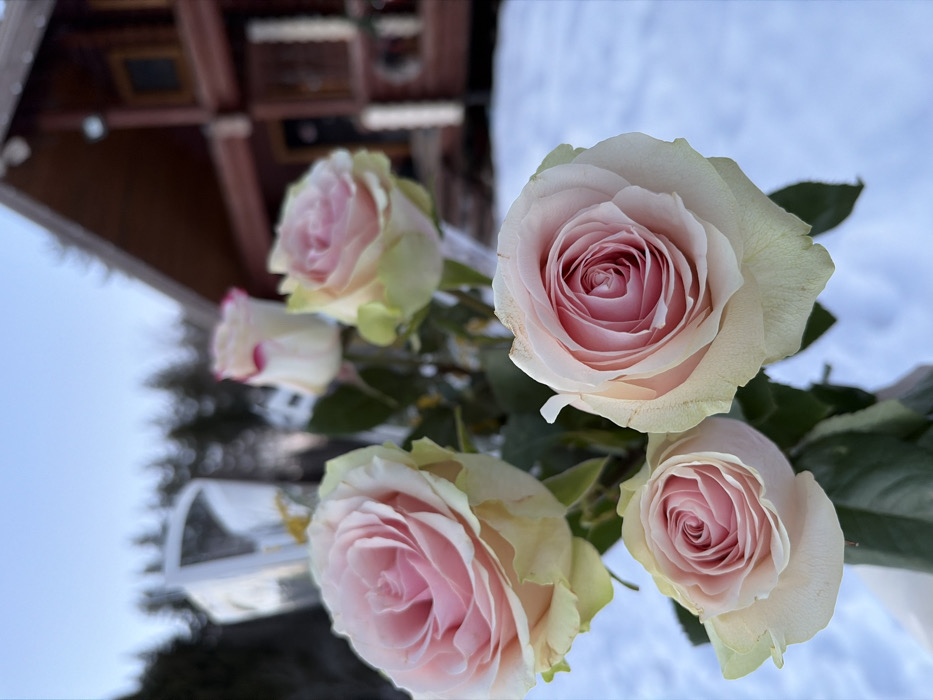 - "The image displays a bouquet of five roses in sharp focus, positioned in the foreground against a blurred winter landscape in Vaskelovo, Russia" by FM-dJ01l1, licensed under CC BY 4.0