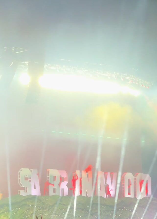 concert stage illuminated with bright, thin white beams of light, directed upwards. In the foreground, illuminated in red, is the word "SABRINA" stacked on top of "CARPENTER," presumably the performer. The background is dark, suggesting an indoor venue. The camera is unsteady, adding to the energy of the concert atmosphere.