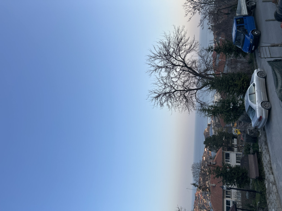 The image depicts an elevated view of Balchik, Bulgaria, overlooking the Black Sea and the surrounding coastal town under a clear, transitioning blue sky, suggesting late afternoon or early morning. In the immediate foreground, a silver Mercedes-Benz E-Class sedan (W210) is parked facing left on a dirt or paved surface, appearing dusty. To its right, a blue Ford Transit flatbed truck is parked, facing right, with an empty bed. Bare deciduous trees with intricate branches dominate the right and center-right, while several dark green coniferous trees are also visible. On the left, a white building with a prominent red-tiled roof stands, with a brown wooden bench positioned beside it. The midground features numerous houses with red-tiled roofs characteristic of the region, built into a hillside, interspersed with green and bare trees. Distantly, yellow construction equipment is visible among the buildings on the left. The background is dominated by the calm, light blue waters of the Black Sea, stretching horizontally across the scene, with the distant coastline visible. No individuals or active interactions are present.