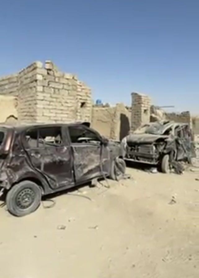 desert-like environment with damaged buildings. In the foreground, there are two destroyed cars. Three men on a motorcycle drive past the damaged vehicles, further into the town. One man in front carries a rifle. The sky is clear and blue.