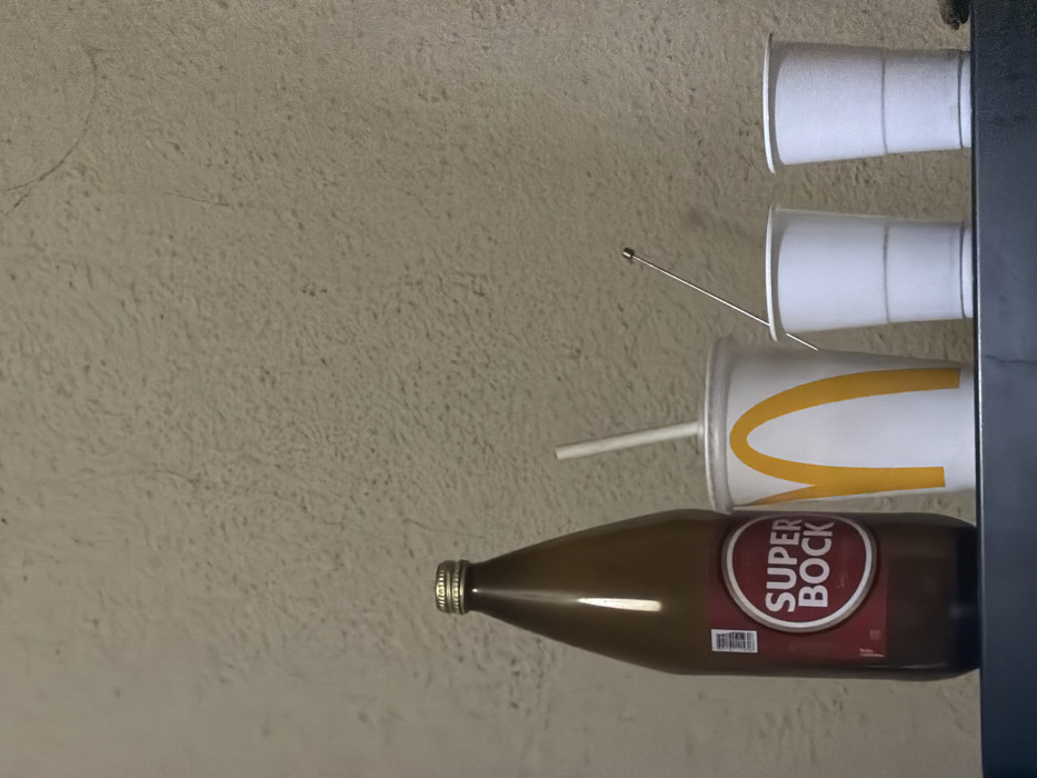 Three stacked white cups and a Super Bock beer bottle are aligned vertically against a textured beige surface