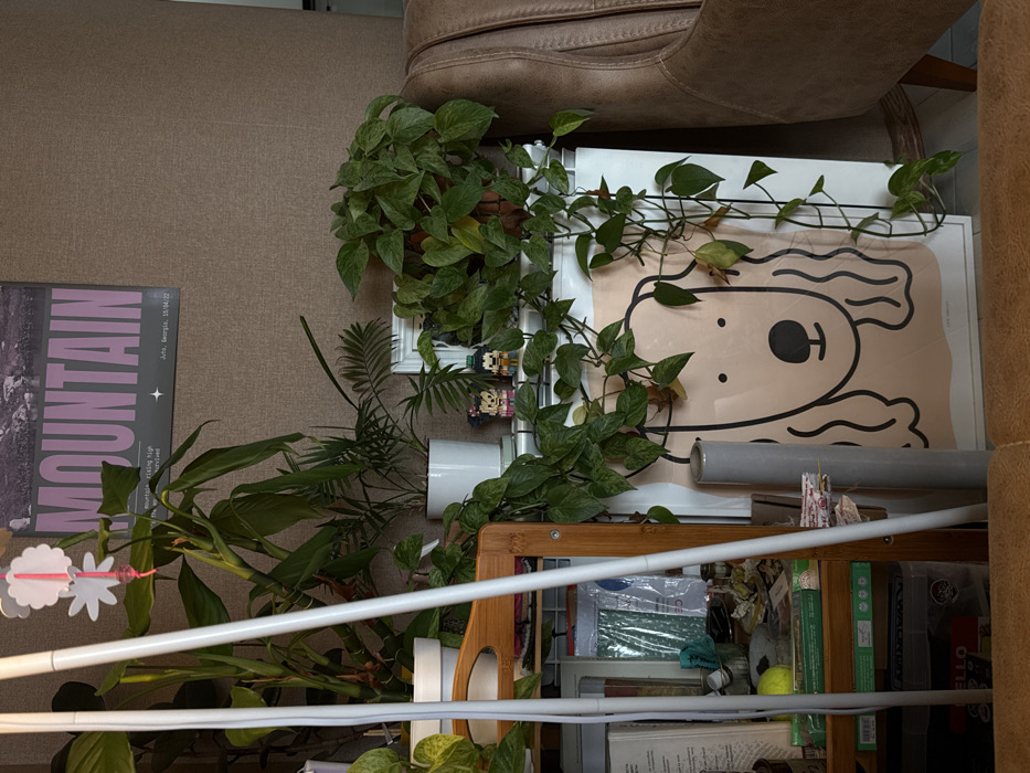 A cluttered scene reveals a variety of elements. A sofa and chair provide seating. A framed cartoon artwork and a "MOUNTAIN" magazine add character. Plants of different species, including pothos and palms, create a mini indoor garden. A bamboo shelving unit houses various items, including books, a tennis ball, and assorted knick-knacks. Lego figures are also present, adding a playful touch. A clothes rack stretches across the scene.