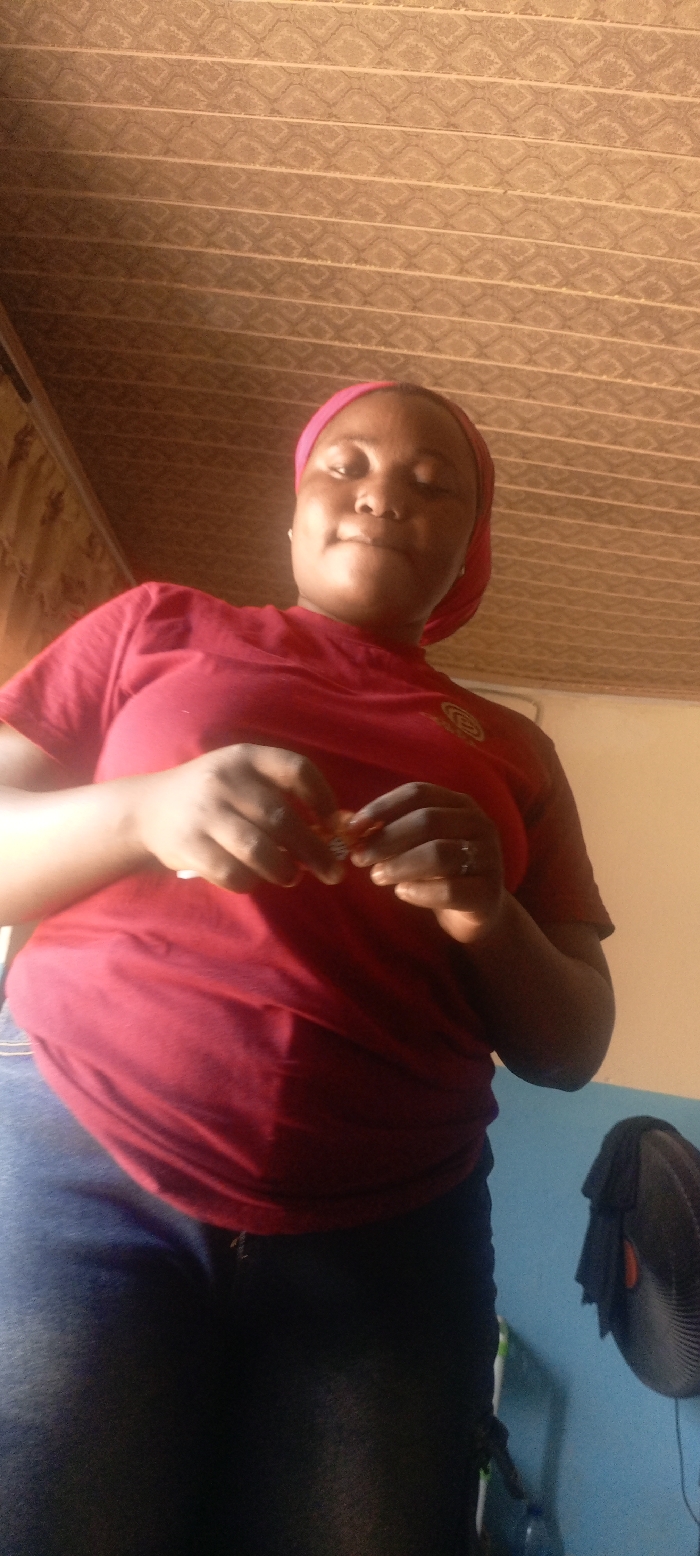 An indoor, low-angle photograph captures an adult individual, appearing female, within a room in Unknown, Unknown. The individual, with a dark complexion, is positioned centrally in the frame, wearing a red short-sleeved t-shirt, dark blue trousers, and a red head covering. A silver-toned ring is present on the left ring finger. Both hands are engaged in manipulating a small, light-colored, possibly wrapped object in front of their torso. The individual's head is tilted slightly downward, with eyes partially closed and a neutral facial expression. The ceiling consists of light brown or beige panels with a repeating geometric pattern. The left background features a light-colored wall, while the right background shows a blue-painted wall. A black stand-up fan, partially obscured by a dark cloth draped over its top, is visible against the blue wall on the right. A clear plastic bottle is partially visible near the floor on the right side.