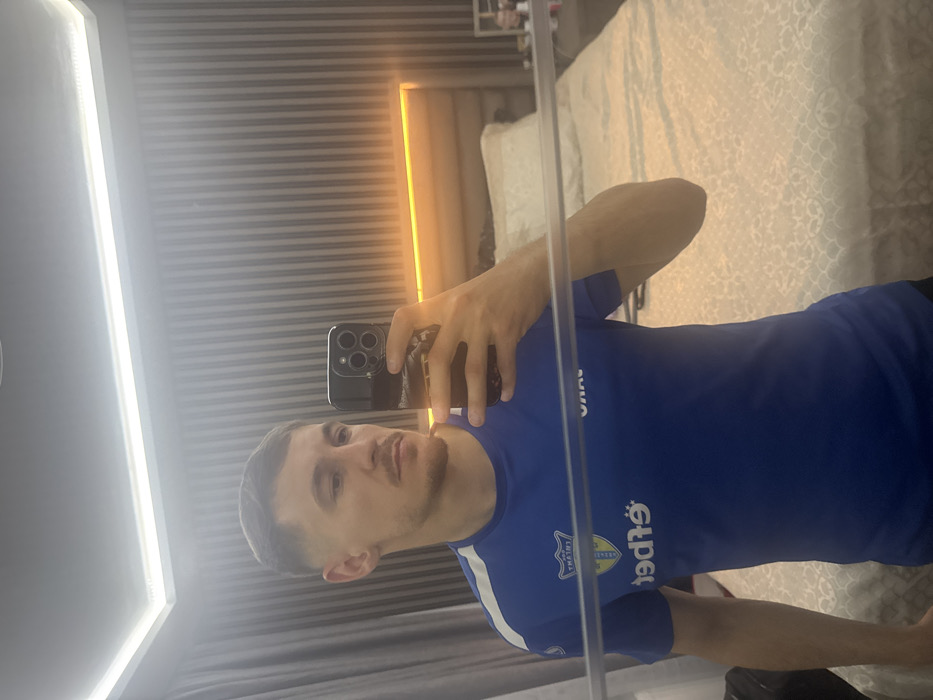 A male subject is depicted in a full-frame mirror selfie, taken within an indoor bedroom setting, identified as being in the city of Kostievo, Bulgaria. The subject is an adult male with short, faded hair and light facial hair, including a mustache and stubble. He wears a short-sleeved royal blue athletic shirt featuring a yellow and blue crest-like logo on the left chest and mirrored white text beneath it. Additional mirrored white text is present on the right chest. He holds a dark-colored smartphone, equipped with at least three rear camera lenses, in his right hand, positioned to capture his reflection. The reflected background reveals a modern bedroom. Centrally, a bed with a light-colored, intricately patterned comforter and white pillows is visible. Above the bed is a padded headboard, behind which an orange-yellow LED strip light illuminates the wall horizontally. The wall behind the bed features vertical grey and lighter grey striped wallpaper or paneling. To the right of the bed, a dark nightstand or table holds a framed photograph. Dark grey curtains are visible on the left side of the reflection. The ceiling, visible at the top of the image, includes a recessed perimeter strip light emitting a cool white glow. The scene is artificially lit.