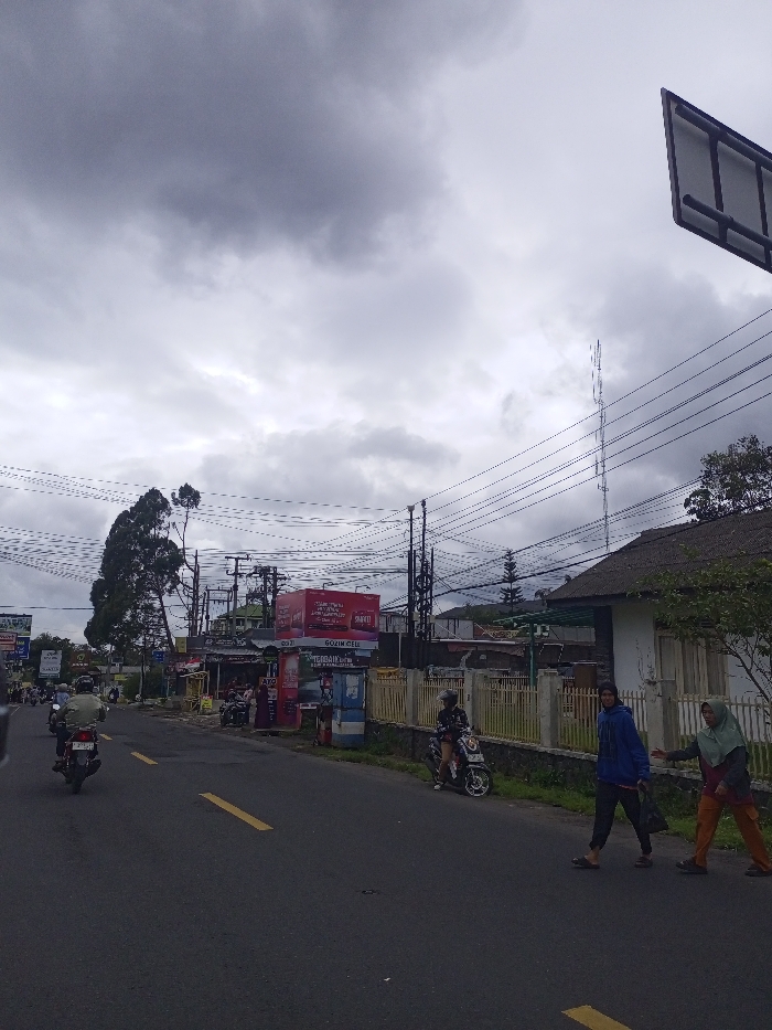 A street scene under a cloudy sky shows multiple people, some on motorcycles and others crossing the road