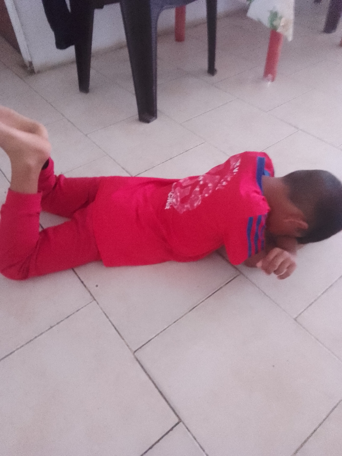 A young child is depicted lying prone on a light-colored, square-tiled floor in an indoor setting within Altagracia, Venezuela