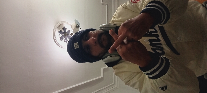 - "A man with a dark beard and a navy blue beanie is wearing headphones around his neck and a cream-colored Yankees jacket with navy blue trim" by FM-oKOCt2, licensed under CC BY 4.0