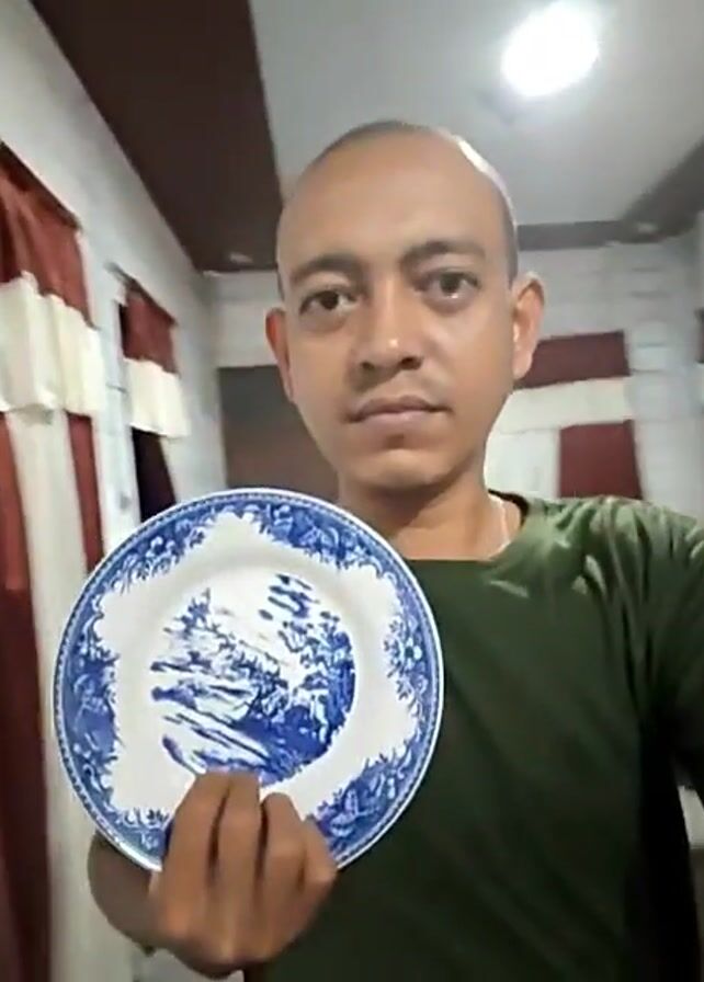 A man is holding up a plate. He is bald and wearing a green shirt. The plate is white with a blue design. Behind him are curtains that are brown and white. The room is fairly bright. The man is looking directly at the camera with a neutral expression.