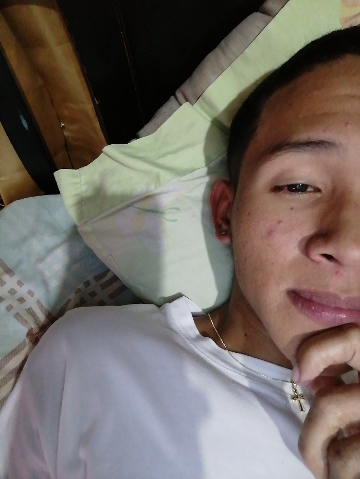 A person is lying on a bed with pillows behind their head. They are wearing a white t-shirt and a gold chain with a cross pendant. Their head is shaved, and they are holding their hand up to their mouth. The bed has blue and white patterned sheets and a green pillowcase. A brown headboard is also visible in the background. The person appears to be looking directly at the camera.