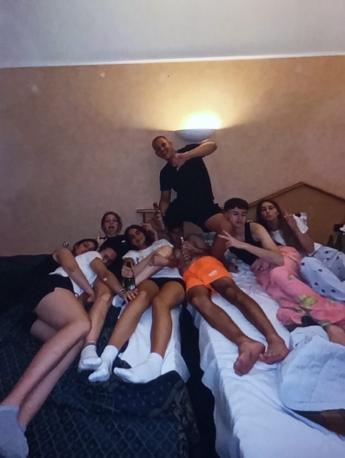 The scene depicts seven young adult females and one young adult male gathered in a room in Aktash, Uzbekistan. The individuals are positioned on or around beds covered with white and dark patterned bedding. A male, centrally located in the upper portion of the frame, stands on a dark patterned bed, wearing a black t-shirt and black shorts, holding a dark bottle in his left hand and making a 'thumbs up' gesture with his right. To his right, another male in orange shorts lies barefoot on a white-sheeted bed. Five females recline on the beds surrounding them. One female on the left, wearing a white t-shirt and dark shorts, holds a green bottle. Another female on the far right wears pink patterned pajama bottoms. Clothing includes casual wear, such as t-shirts and shorts; white socks are visible on two females, and at least two individuals are barefoot. The room features light-colored walls, with a wall-mounted sconce providing warm upward illumination. A dark wooden headboard or furniture piece is partially visible on the right.