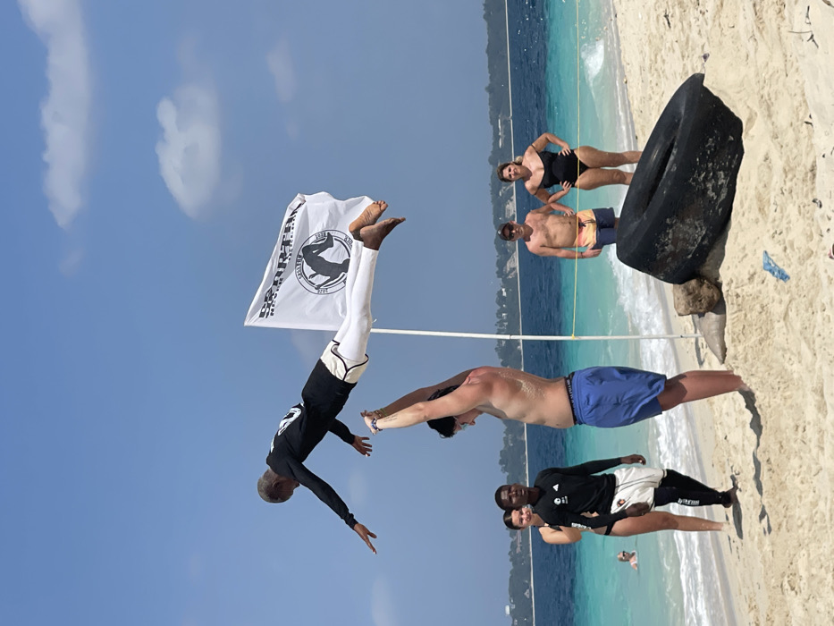 The image depicts an outdoor acrobatic performance on a bright, sunny beach in Zanzibar, Tanzania. In the foreground, two males are engaged in an acro-yoga pose on the sand. A light-skinned male, shirtless in blue shorts, acts as the base, lying on his back with legs extended vertically, supporting the feet of a dark-skinned male, the flyer. The flyer, wearing a black long-sleeved shirt with a white number "26" on the back and white long pants with black trim, is held horizontally in the air, arms outstretched forward. To the right of the acrobatic pair, a white flag on a pole is planted in the sand. The flag displays a black logo featuring a figure in an acrobatic pose and partially visible text, including "SPARTAN" and "NEVER GIVE UP." A large, dark-colored tire rests horizontally on the sand in the lower right foreground. Several individuals observe the scene from the shallow, clear turquoise water behind the performers. From left to right: a dark-skinned male in a black long-sleeved shirt and white shorts over black leggings; a light-skinned female in a black bikini top; a light-skinned male in patterned swim trunks and sunglasses; and a light-skinned female in a black one-piece swimsuit with hands on her hips. A faint figure is visible swimming further out in the water on the left. The background features the calm, multi-toned blue ocean and a distant landmass with visible structures on the horizon. The sky is clear blue with sparse white clouds.
