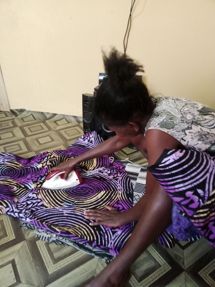 An individual is depicted in an indoor setting in Iju, Nigeria, performing the act of ironing