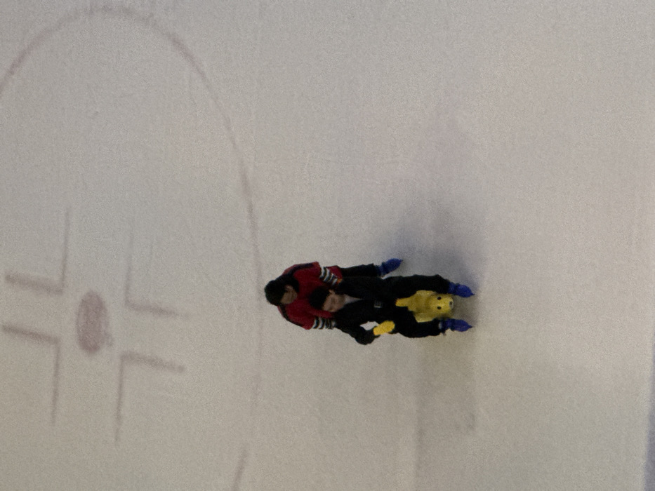 On an ice rink, a group of three people lie prone in a line. The first person wears a red and black jacket. The second person wears black. The third person wears a yellow mask and a black suit. All three wear blue skating shoes. To the left, an ice rink bullseye marking is visible.